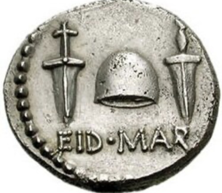 4 两年后的42年秋季,Brutus 发行了一枚银制纪念币。背面刻有EID MAR。是Eibus Martiis 的缩写。意思就是Ides of March 三月十五日。下方是一顶象征自由的帽子。帽子的两侧各有一把匕首。