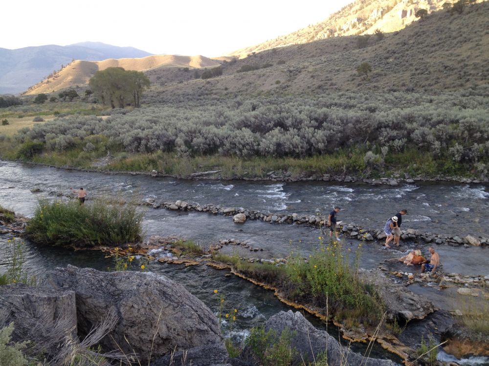 回到营地稍事休息,我们便去昨天踩点的地方泡温泉去了。条件虽然简陋,也不能使用浴液,以免污染河水,但对于几天来一身臭汗,没洗过澡的我来说,那种清爽的享受,给十个肉包子都不换。河水并不深,水底石头凸凹不平,趟水前行,一条腿在Gardiner River 的冷水流,另一条腿在 Boiling River的热水流,冰火两重天的感受,稍不慎迈偏了一步,就可能被热河烫着了。找一冷热水流的交汇处躺下来,头枕石头,看夕阳照亮山峰,直到最后一抹金色慢慢褪去,蒸腾的热气夹着一股硫磺的味道在暮色笼罩的河面上飘荡,钻进鼻孔里,沁到骨头里的温暖和舒服,怎一个爽字了得!