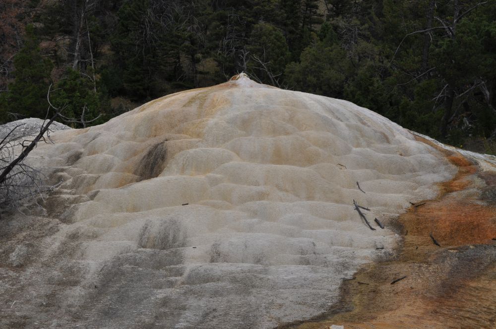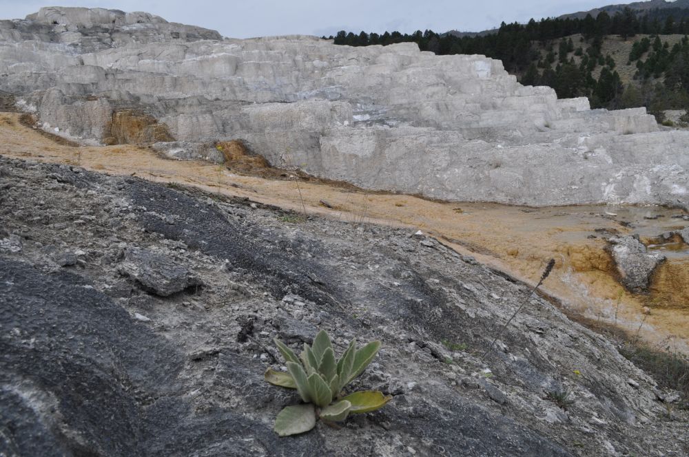 在游览区的木头栈道上,我们巧遇了一个女公园巡逻员,正在为几个游客做讲解。她后来告诉我,这是公园的Park Ranger Program,每天早晨十点钟开始为游人免费服务。听了她的讲解,我更深入地了解猛犸象地区的地理知识。猛犸象地区有着复杂的地下水通道系统,四季降落的雨雪渗透入周围山区经过深处地热的加热,形成热泉,然后通过这些复杂的通道,流出地表,形成眼前的梯田热泉景观。每一处景观的形成都有赖于地热水的作用,而且地貌是在不断运动变化的,你今天所见的景观,明年再来可能就消失了。像我们身后这处活跃的热泉梯田,可以说是今日明星,仅仅是几年前开始形成的,而且还在不断变化中。