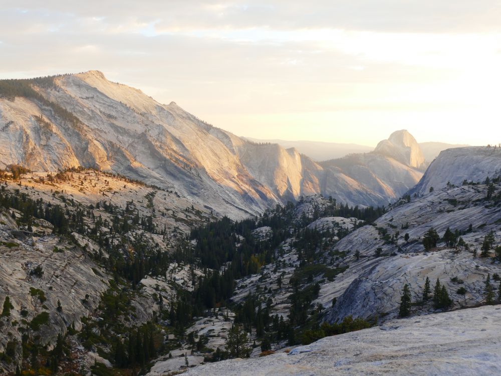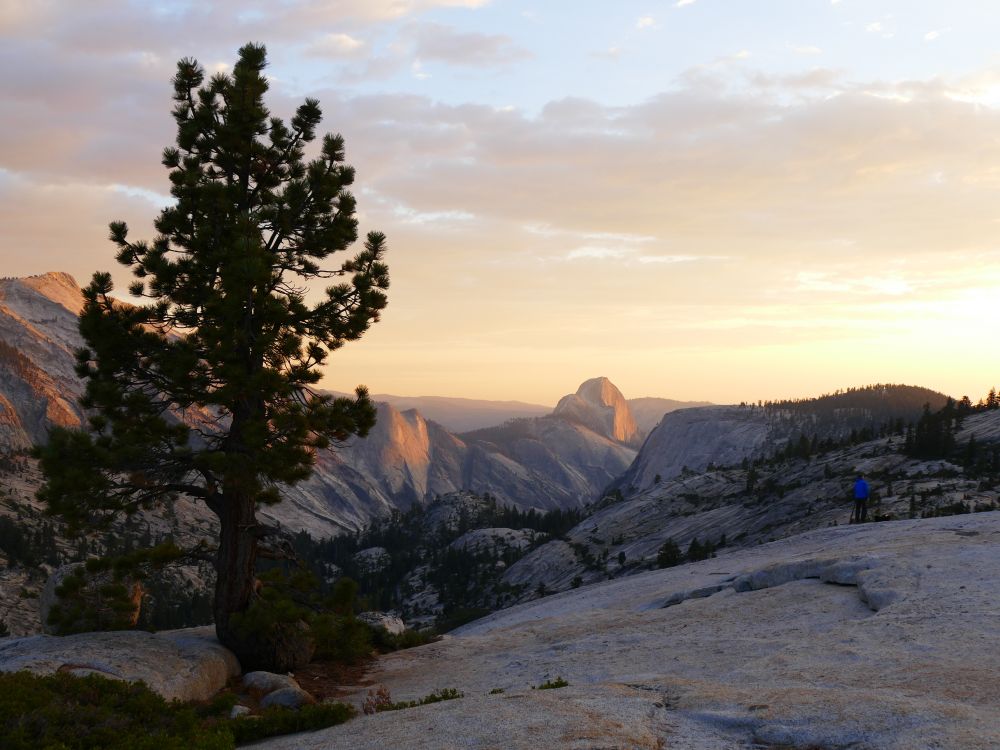 以悠闲的心情和步伐走完了May Lake,推荐绕湖走一圈,虽然没有路。在回到停车场的路上,没忘了在营地听到的忠告,捡了几根干枯的树干,事实证明,晚上升篝火非常好的材料。从May Lake出来,继续向东,不远处就到了路边的一处观景点--Olmsted Point,以美国著名景观建筑师,Frederick Law Olmsted,纽约中央公园的设计者为命名。不要仅满足于停车场那处的风景,沿石阶走下去,有一条短路,通向山顶的瞭望点,那里才见绝佳的风景。我们没有过多停留,因为我想回来看日落。于是我们沿Tioga Road 继续向东,前往Tuolumne Meadows地区,想去看看那里的visitor centre和Soda Springs Trail。现在是淡季,visitor centre和其它的一些设施都关闭了。根据前些天的经验,日落的时间大约在640-7pm之间,我们不敢耽搁过久,调头回程,赶到Olmsted Point大约630pm,时间刚好。怀着憧憬,我们重回山顶的瞭望点,落日的大戏慢慢上演。Half Dome左边,最高点处就是Clouds Rest (海拔9926英尺),站在那上面,可以俯瞰Half Dome了。