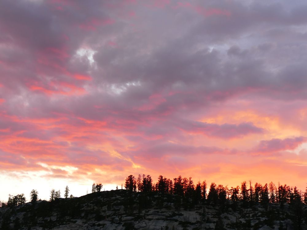 此时远方的Half Dome和它前面的Sub dome在我眼前呈现出一幅日落油画,这是我看到的最美丽的Half Dome。如果在白天,你手里有一个望远镜,会看到北面山坡上蚂蚁一般向上攀登的人们。昨天我们就是这样的小蚂蚁,我懂得那种艰辛和努力,所以现在我饱含深情望着Half Dome,默默地欣赏它披着余晖的风采。