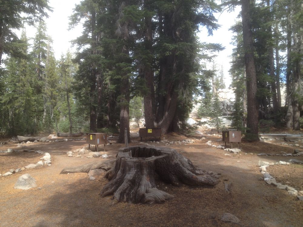这一晚睡得香甜,直到自然醒来。早饭后,收拾行囊上路,按计划北上,然后沿着Tioga Road ,进入公园北部的Tuolumne Meadows地区。在Crane Flat 营地附近的一个岔路口有一个商店和加油站,不要错过呦,那可是公园北部唯一可加油的地方,开山路费油。现在开放的营地有限,只有两个选择:Crane Flat和Porcupine Flat Campground。 按我的行程计划,我们先去Porcupine Flat Campground,因为它在整个区域的中部。营地开放时间从每年七月至十月中旬,先到先得,52个露营点,没有冲水厕所。我们十点多钟才赶到营地,正开车在营地里寻找空位,见20号营地一个白人女子正在拆帐篷,便上前搭讪,她果然要走。这个营地是我喜欢的那种,位置隐秘,树林环绕。闲聊中,她说一个人已经在这儿呆了七天了,她也很喜欢这个营地。我问她是不是走了很多Trails,她说没走多少路,就是喜欢这种自然安静的感觉,她的最爱是Soda Springs Trail 。临走时,她还把一份地图留给我,我连声称谢,她笑笑说,我不是第一次来这里的。我们挥手向车窗里的她告别。如果她换身职业装,坐在玻璃大楼的写字间里,绝对是一个精致的白领,谁会想到这样一个斯斯文文的女人会热爱荒野丛林呢。我们搭好帐篷,在营地中转悠,熟悉一下地形,发现52个露营点只剩下一两个空位了,多亏来得早。在营地里没找到理想生火用材料,树木过于湿硬,邻居营地的小伙子告诉我,这里不行,在一些徒步路线上可以捡到很好的枯木。