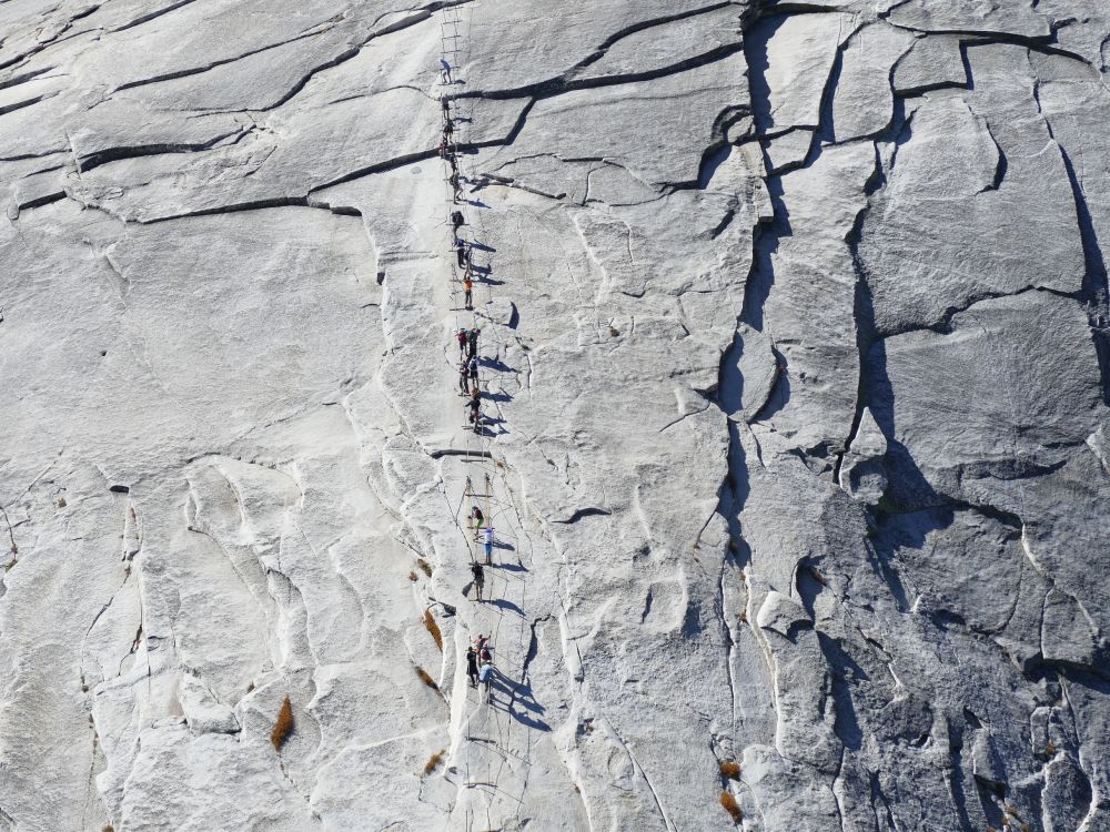 小结:由于秋季枯水期,无法领略瀑布之美,风景颜值打折。徒步最艰苦的一段是登顶前的Subdome那一段“Z”字型的陡路。最后那段登顶的铁索路则是对我恐高心理的极大考验。震撼一刻:登顶下来,由于前面的人恐高大家都停滞下来。这时一位牛人等得不耐烦了,脱离了索道,没有任何保护装置,在光滑的石壁上一步步走下Half Dome。那情景如好莱坞大片般的震撼,亲眼所见,没有特技。