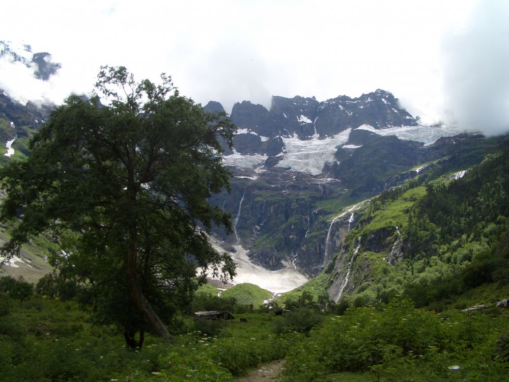 我们中午时分到达上雨崩村,找了间客栈住下。吃过午饭后,看时间尚早,听人说去神瀑只要3个小时,就又出发了。去神瀑要经过下雨崩村,村里的道路非常泥泞难走。出了村子就好了,一路上景色优美,雪山、青草、瀑布、野花。