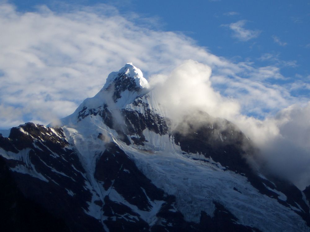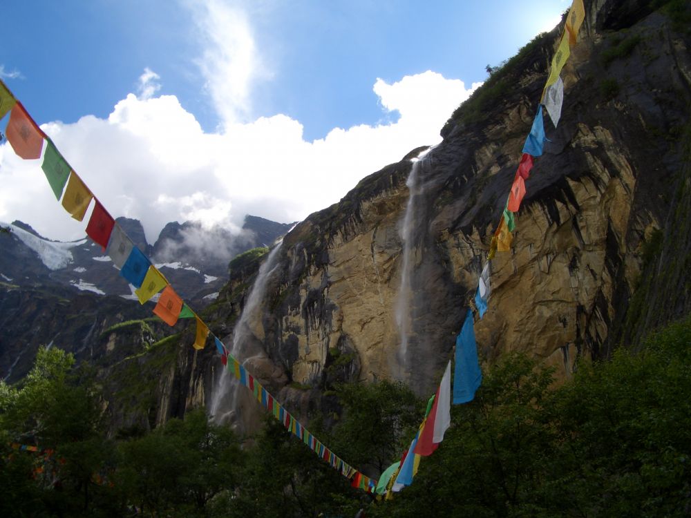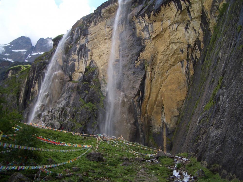 他们还邀请我们跟着他们一起转神瀑,盛情难却转吧,怎么转?就是一行人走到瀑布底下,让这冰川上流淌下来冰凉的水,劈头盖脸,浑身上下来个透心凉,毫无心理准备的我们立马变成了落汤鸡。望着司机大哥竖起的大拇指,我一脸的苦笑。这么折腾一下,如果着凉感冒,在这儿缺医少药的高海拔山区,得了病可不是闹着玩的。老天保佑,一路上我们身体一直无恙。司机大哥还给我讲了一个真事,一年夏天,一对年轻游客来到神瀑,光着身子在瀑布下洗澡,当地人认为这是对神的大不敬,可他们不听劝阻,依然我行我素,这时奇异的事情发生了,瀑布上居然落下一块大冰坨,一下把两个人都砸死了。司机摇头道,我从来没听说上面掉下过大冰块,尤其夏天。我不知道这神瀑是否具有神力,就像那从未被人类登顶的卡瓦格博主峰,一直被神秘的传说和奇异的事件所笼罩,它是藏人心中的神山,中日美各国登山队对它的一次次挑战都以失败告终。信与不信由你,但起码要学会尊重别人的风俗和信仰。
