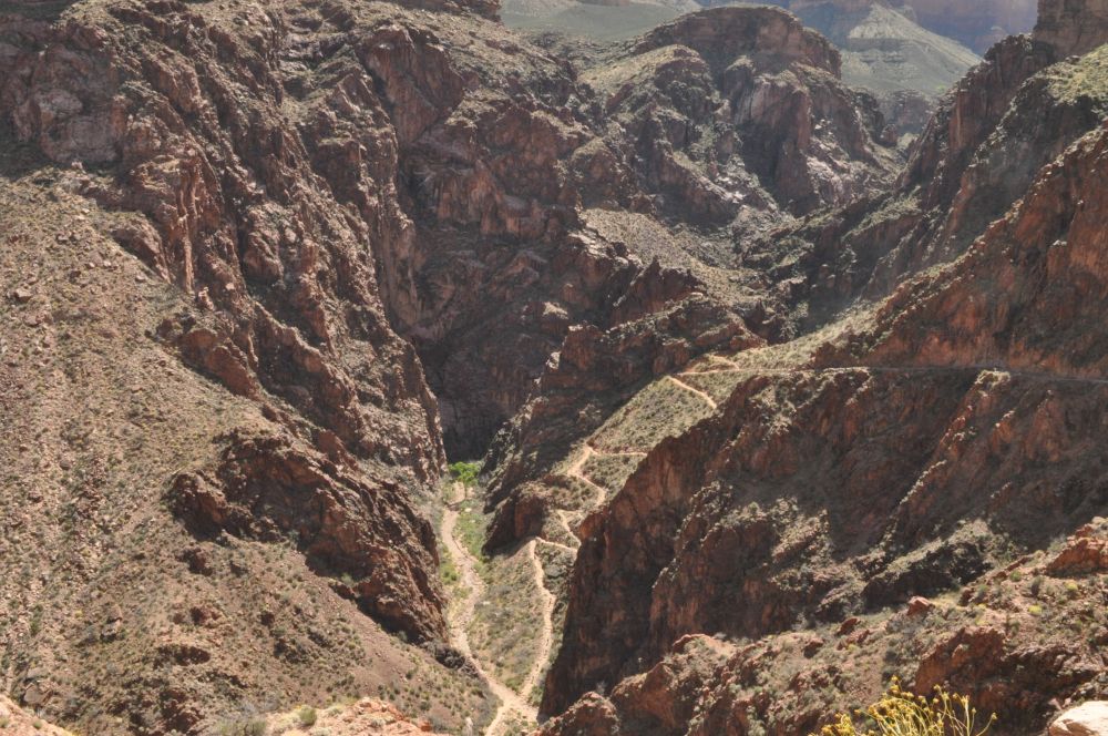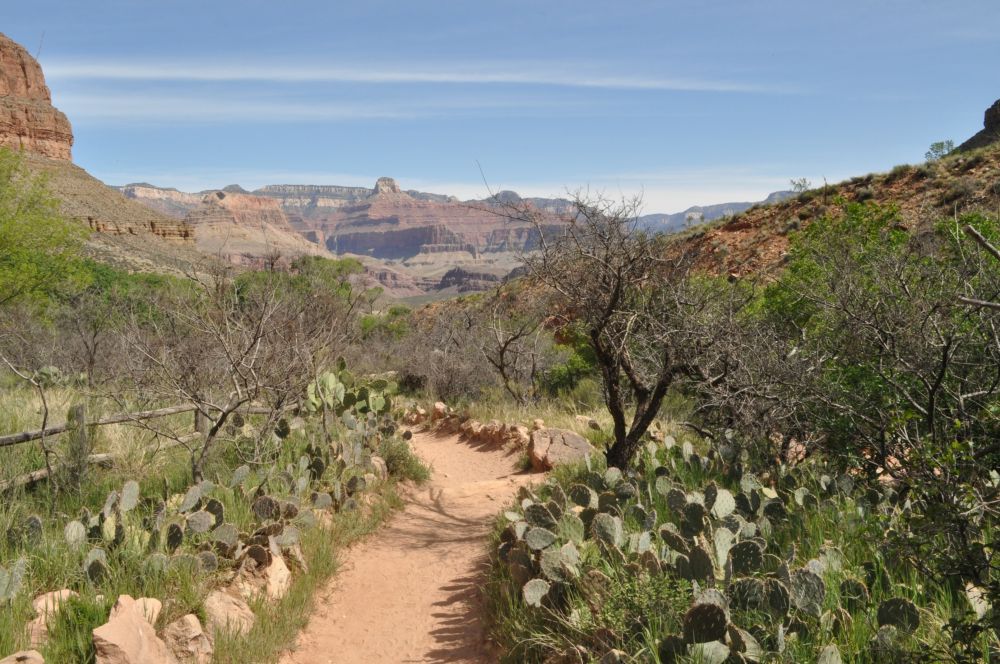 终于那一抹绿色不再是远处的一瞥,变成眼前实实在在的树木花草。望着远方苍凉的红褐色岩壁,这里的郁郁葱葱让我有些恍惚,Indian Garden仿佛是大峡谷中的一处伊甸园。这里是途中休息的好地方,有厕所,饮水,和露营地。我们看时间尚早,体力充沛,就临时改变主意,继续前行。我们的同伴从此返回。