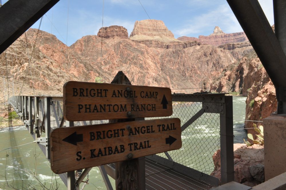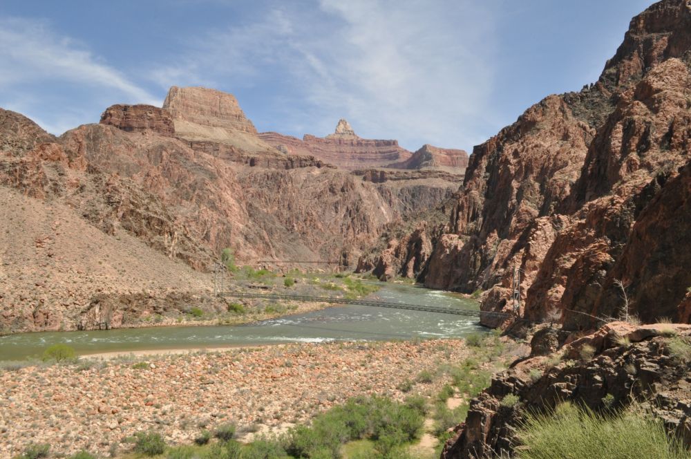 两座铁吊桥横跨科罗拉多河上,R2R的徒步者就从这里过桥横穿峡谷。此处的河水清澈舒缓,诗情画意,还没露出它汹涌咆哮的面目。
