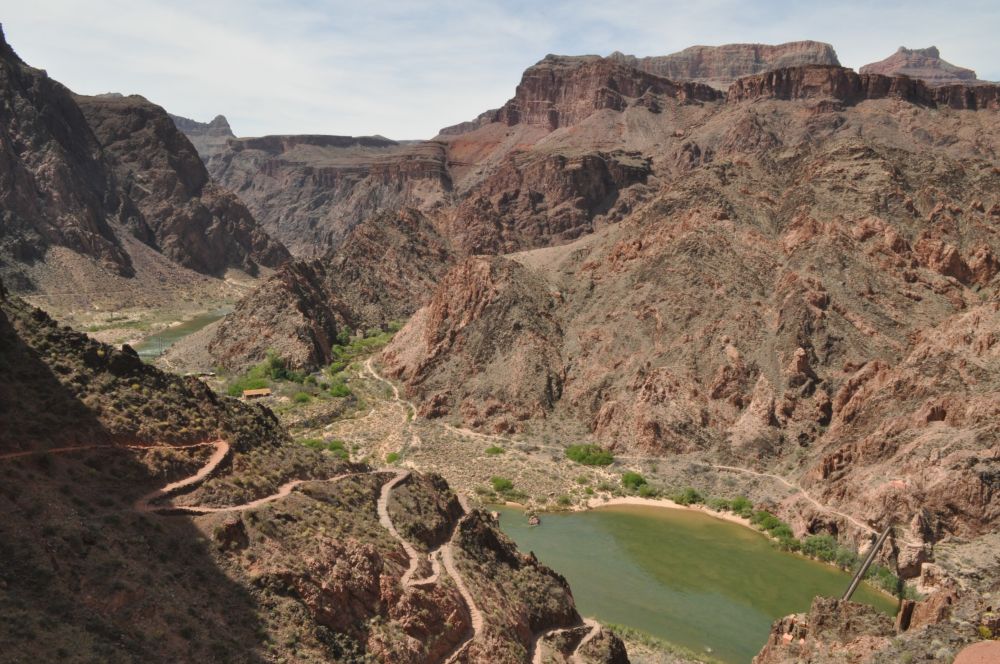 在河边休整后,我们沿河继续前行,来到River Trail Junction(2440 feet/744m),Bright Angel Trailhead to River Trail Junction 7.8 miles (12.6km)。从这里过桥可以前往幻影牧场(Phantom Ranch),能想象到这么荒凉的峡谷中会有个饭店吗?幻影牧场够虚幻的。河对岸Bright Angel Campground有水源,当时我们觉得剩下的饮水还够用,为了节省时间赶路就没过桥补充补水。我们下山时,天气不热,体能消耗不大,没感到口渴而已。这是我们犯的一个错误。其实我们所做的准备只是走到Indian Garden ,两瓶运动饮料750毫升/瓶,4瓶矿泉水,总计:3500毫升,这么长距离的徒步,还不足一个人的需用量。路上遇到的一位独行老人,这样的上下他已经走了N多次了,还好心提醒:South Kaibab Trail上没有水源。