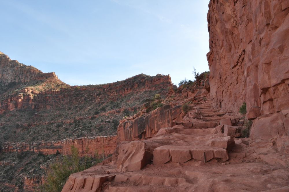这一夜营地非常安静,我们睡了一个好觉(至关重要)。第二天早饭后,我们和同伴一起搭乘公园内的Shuttle Bus来到了Bright Angel Trailhead(6860 英尺/2019米)。早0840出发了。俯瞰那条蜿蜒而下的小径,那就是我们要走的路了。