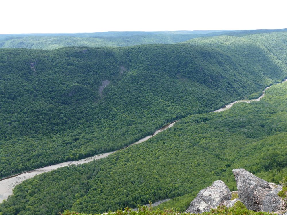 第二天早上10点,根据前一天在游客中心获得的信息,参加了Salmon pools trail guided walk,trailhead就在#46营地附近。那位公园的女领队一路上给大家讲了不少动植物的知识。还记得她指着一棵树干布满大大小小硬结的树说,这是一种叫“Beech”的树,由于一种不慎从欧洲被带过来的害虫,现在这种树差不多要死光了,谁要是能发现一棵不被虫害侵袭的树,请报告公园,那意味着那棵树已经对害虫产生了自然的免疫力了,值得研究。Salmon pools自然是大西洋三文鱼回流产卵的地方,现在不是季节,看不到三文鱼,池水的颜色是水底的矿物质造成的。沿着溪流一共有三个池,她只领着我们走到第一个池。她说在第三个池有一把红椅子,由于上次的洪水爆发,椅子被冲走了,现在空无一物。所以事实上现在公园里只剩下九把红椅子了。