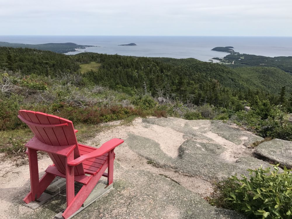 第一把红椅子,第一天到达Cheticamp营地GPS: 46.652105, -60.953471,扎营后徒步附近的Acadian Trail (Loop) 8.4km 3-4hrs,Trailhead 就Cheticamp游客中心停车场附近,在山顶的最后一个观景点我们发现了这把红椅子。这条徒步线路景色不错,山谷幽静,清静少人。