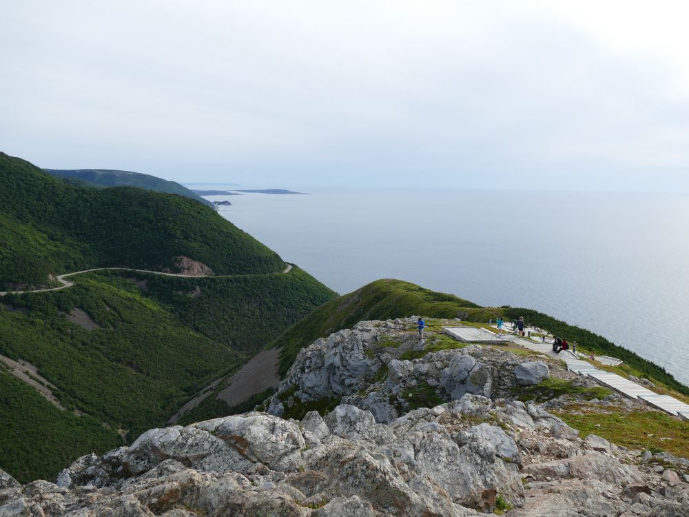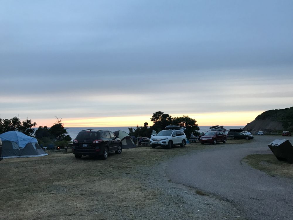 吃完那顿中晚饭,我们就前往今晚的营地Broad Cove Campground (GPS: 46.710069, -60.365927),大约一个小时的车程。一路上不时有施工地段,会延误交通时间。沿途都有观景点可以停靠看风景。Broad Cove营地条件挺好,有热水淋浴,晚上的露天剧场还有给小孩子讲故事的活动。一直以为蚊子会很多,临行前准备了好几瓶子防蚊喷雾,可是没什么用武之地。第二天早晨走了Coastal Trail 11.3km and Jack Pine (Loop),走了大约4小时,Coastal Trail是沿着海岸线行走的一条徒步路线,风景优美,路边低矮的灌木中还有美味的浆果。