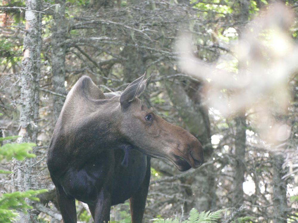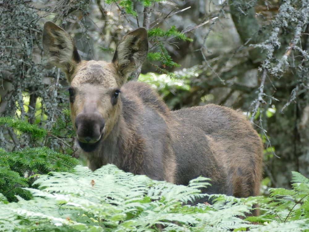 在上山途中我们幸运地看到了两只moose, 多走路还是有好处的,一大一小,这是小麋鹿,它的个头已经不小啦。