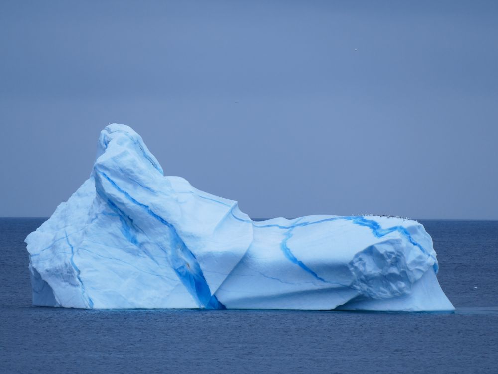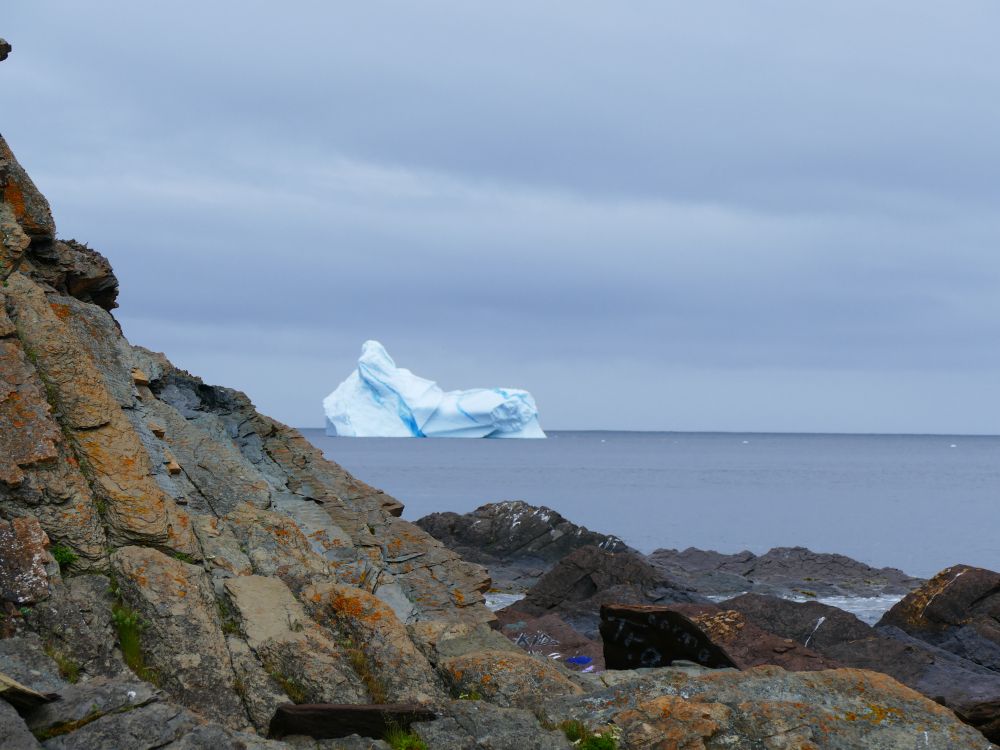 这是我平生第一次目睹海上的冰山。它以奇特的形状遗世独立,那种蓝白相间的素静美,在阴霾的海天之间,一点不妖娆,一点不招摇,融入自然,沉静中释放着一种震撼的力量,如果乘船近距离观赏它巨大的体积,想必那种震撼的效果会更强烈。在纽芬兰看到冰山不稀奇,可八月的海上那座美丽的冰山梦幻般出现在眼前,不由得感谢上苍撒下的一点厚爱,让我们偏得一份旅行的收获。(现在才知道在icebergfinder.com上可追踪冰山最新动态和信息)