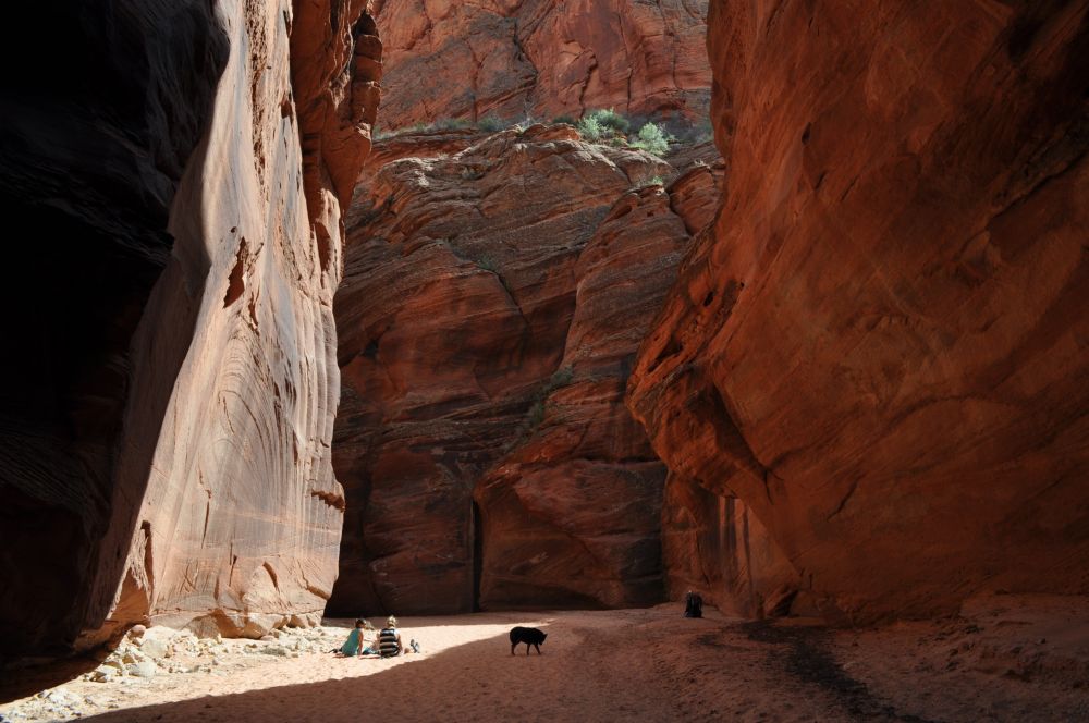 我们于是从巨石处原路返回。在Wire Pass trail汇入Buckskin Gulch的地方,注意这是唯一的一个岔路口,也是问题发生的地方,居然碰到两个游客坐在地上悠闲地嗮太阳。