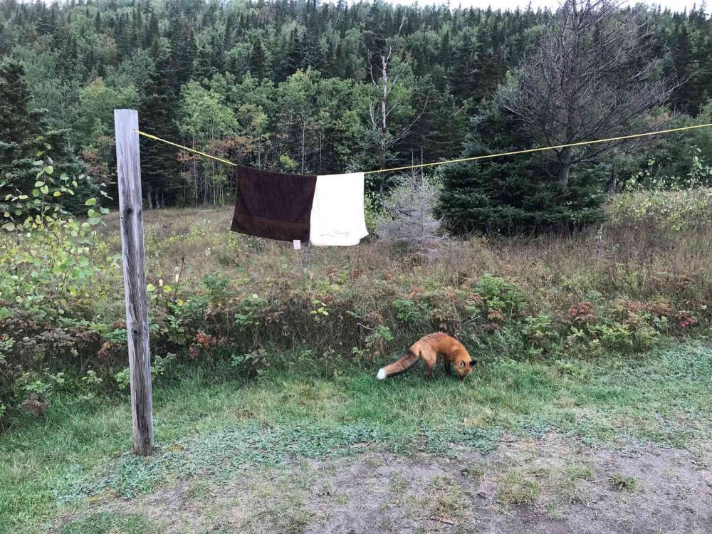 早晨迷雾消散。喝咖啡的时候,我们还念叨昨晚上看见的那只漂亮的狐狸,戏称它为:九尾神狐。不曾想,它悄然而至,一身金毛,黑色的短腿,黑色的尖耳朵,拖着一条粗大的花尾巴,大大方方,转来转去,近在咫尺。停下来,面对着我,仿佛在说,你也不给哥们儿剩点什么,你照完了哈,我走了,然后消失在对面营地的树林中。我发现营地的木头桌上就贴着一张它的海报照片,原来人家还是有头有脸的。可惜来不及取相机,给它拍个标准照。这个早晨因它的造访而生动。