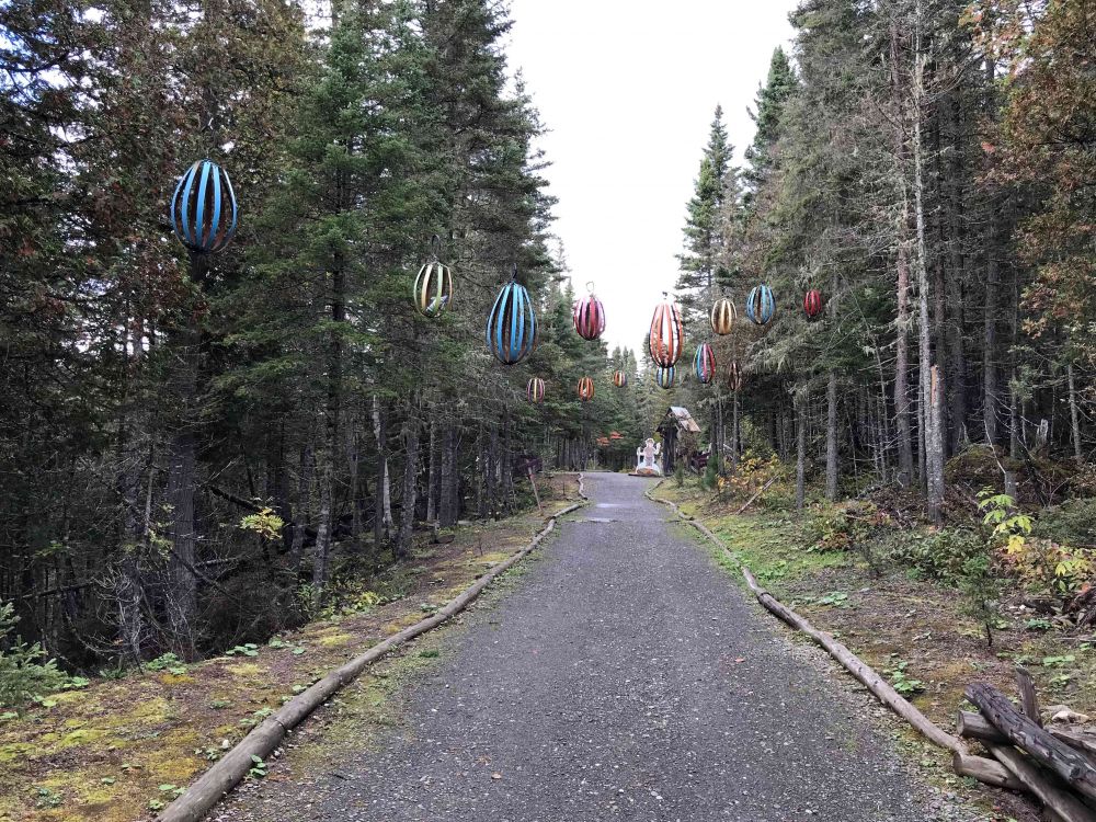 我们顺着车道下山,没走林中的旧路,想尽快赶到那个小岛,也许有机会近距离在岸边观鲸。下山的路上,太阳高照,秋高气爽,心情舒畅,一路上闲聊出一个有趣的故事。去那个岛有二条路,一条通过公园内的自行车道,一条驾车从公园外绕路而至。这个岛在低潮的时候才可走过去。鲸鱼没看到,在海岸边宁静的小渔村小憩后,驾车前往下一站:Gaspesie Park。