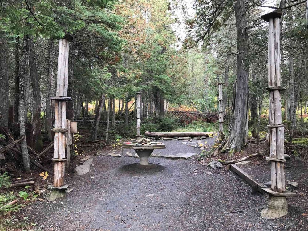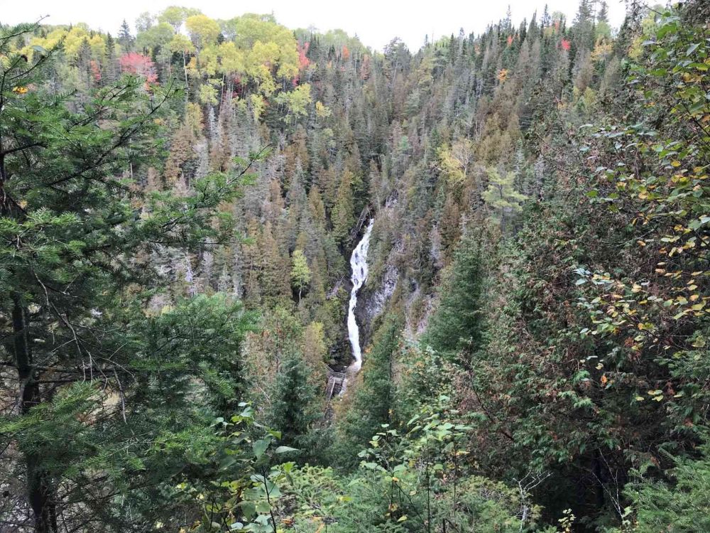 早餐后,我们收起帐篷,去徒步公园内的最高峰——Pic Champlain。山不高,346米,也不陡,走了一个小时来到山顶的观景台,从这里极目远眺。眼神好的妻在望远镜里发现了正在海中游戈的几个黑色的家伙,细数有五只,就在那个岛屿的附近。我们以为是鲸鱼,一阵的兴奋。后来分析可能是海豹。