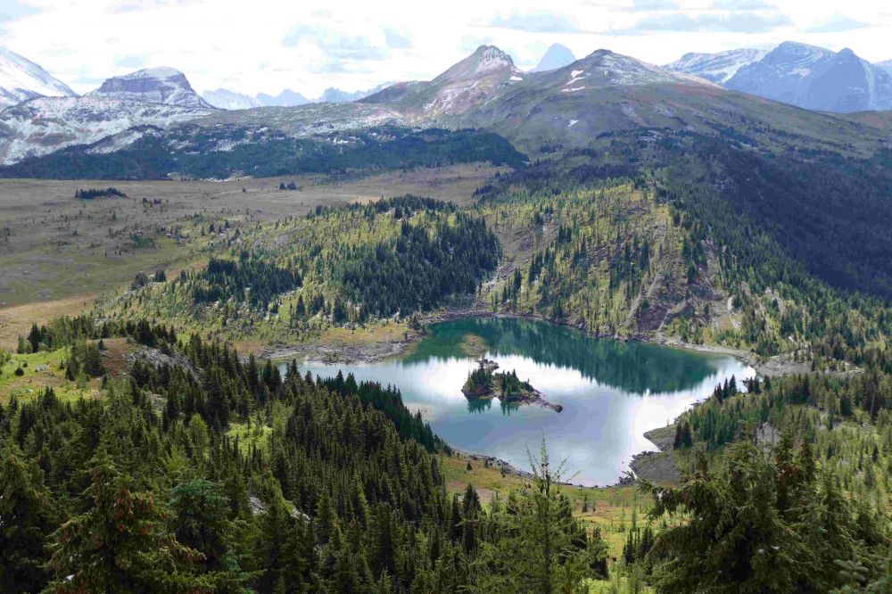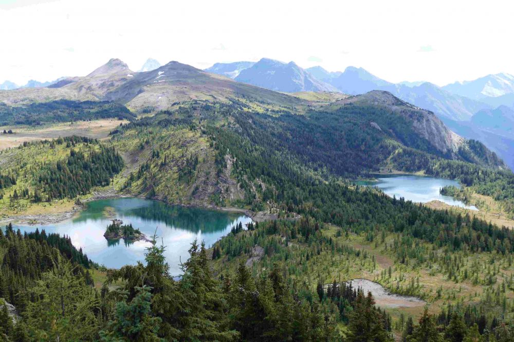 最美的景当属双湖。从高处俯瞰双湖Rock Isle Lake and Laryx Lake,有种人间仙境的感觉。“你在我眼中是最美,每一处风景都让我沉醉”。观景台上有图片介绍,可以知晓远近那一座座山峰的名字。最远处,刺入蓝天的那个金字塔形的山峰就是著名的Mt Assiniboine 海拔3618米,到达那里只能徒步或乘坐直升飞机。眼望山峰,心里暗暗播下了一颗种子。