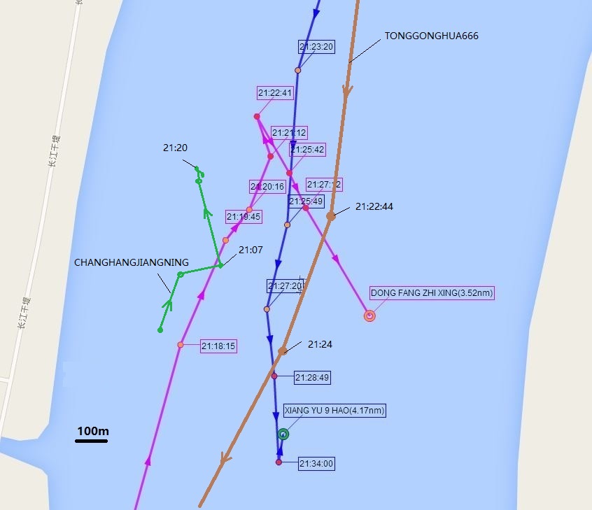 现在已知当晚9点20分前后有四艘船通过事发水域(也许还有其它船,但目前不了解):东方之星,长航江宁轮,向禹9号,和铜工化666。目前宝船网已不允许查询历史航迹,我只能根据别人发表的航迹图,把长航江宁轮和铜工化666的航迹加入到我查到的东方之星和向禹9号的航迹图中去,如下。