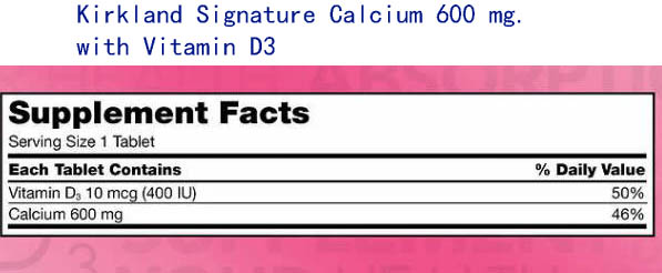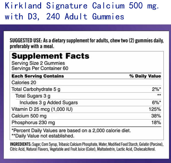 为了验证这个猜测,本人找到了“放心选”的官方网站上的原文,从文中的图片,确认了Kirkland的两个产品分别是Kirkland Calcium 600mg + D3,和Kirkland Adult Gummies Calcium 500mg with D3,然后在Costco官网找到两个产品的含量表:
