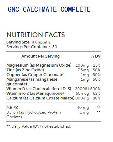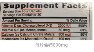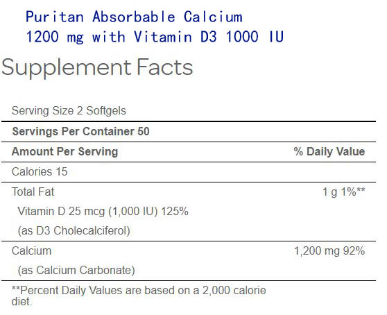 本人又查了文中涉及的GNC产品Calcimate Complete,及Puritan产品Absorbable Calcium 1200mg plus Vitamin D3 25mcg,其含量表分别如下,果然,含钙量分别是4粒和两粒的: