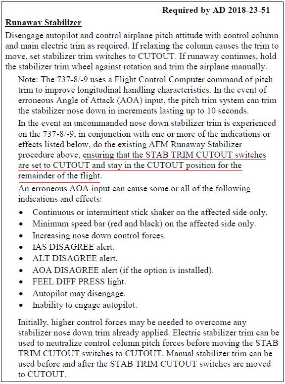 航司和飞行员不会仅仅看这样一份文件就完事的。正常程序下,有其他人员的跟进,模拟飞行演练等等。但是并不知埃塞航的具体情况到底如何。从他们的具体操作看,并没有看出他们被误导。他们之所以后来很可能又接通了安定面配平,是因为安定面的起始位置过低了,由于空速太快手动配平轮又转不动,飞机很难保持高度,最后他们不得已打开电门想用人工电动配平最后博一下。