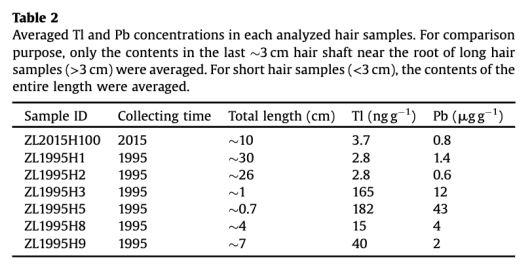 其实准确地说,从文中我们知道所有1995年收集的6根头发都测量了,而且结果也发布在文中的表2了,但是,这只是铊和铅的平均值,特别是对于2根长发和4厘米那根中发,给出的只是发根部3厘米的平均值。我们不知道这三根头发是否从头到尾完整地测量过,但可以猜测很可能是都测了。那么按照前面引的话,其结果应与ZL1995H9相似,这也合理,因为它们都应该是在1994年12月掉落的。那么我们来看表2: