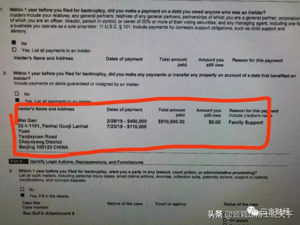 另一张文件截图显示,在贾跃亭提出破产前曾于2019年2月28和2019年7月23日分别向甘薇转账40万美元和11万美元,总计51万美元。在用途一栏标注的是“家庭费用”。