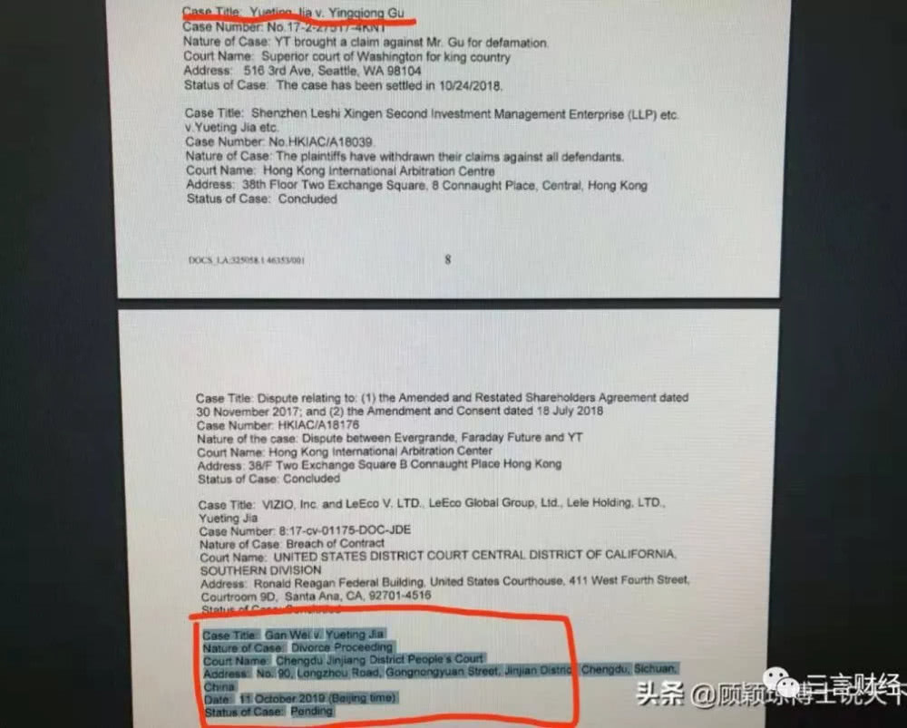 在这份法庭文件截图中,包含多个诉讼案,除了贾跃亭和甘薇的离婚案,图片最上方还有顾颖琼和贾跃亭的诉讼案。