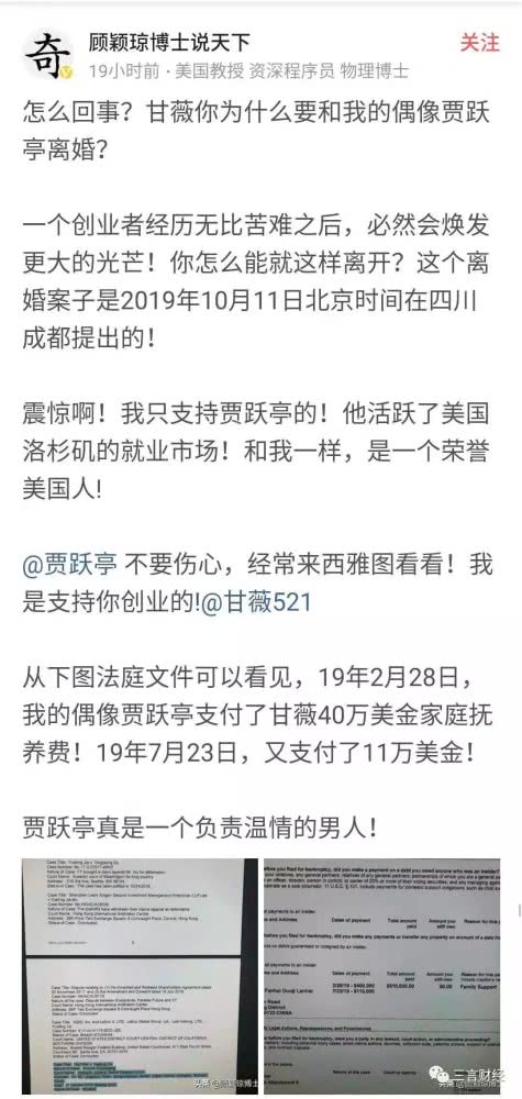 顾颖琼在爆料中似乎有意反问“甘薇你为什么要和我的偶像贾跃亭离婚?”,并在最后称“贾跃亭真是一个负责温情的男人!”