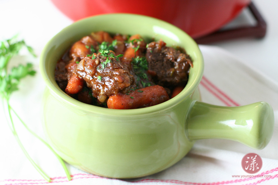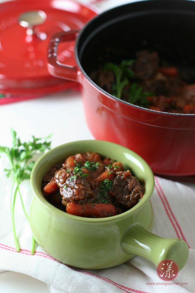 转眼已是阳春三月。过去的这个冬季里,我家饭桌上出镜率很高的一道菜就是红酒炖牛肉,以致于LG认为一定是超级容易做的 :D。之前有好些朋友问我要过方子,至今拖欠着。一来一直都在琢磨着如何可以做的更为简单又美味;二来觉着一定要好好地写一写,才对得起这样一道经典的美味佳肴 : )