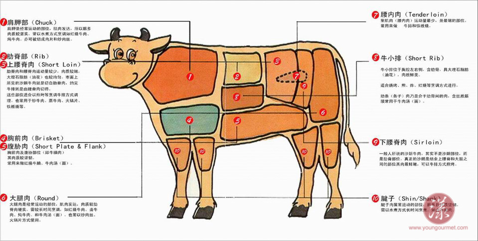 牛腹部及靠近牛肋处的松软肌肉,是取自肋骨间的去骨条状肉。瘦肉较多,肉质较韧,但筋较少。虽然适合用来炖煮,但并非首选。