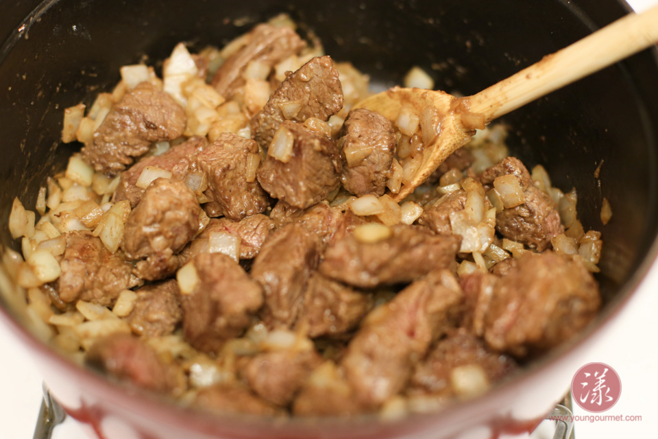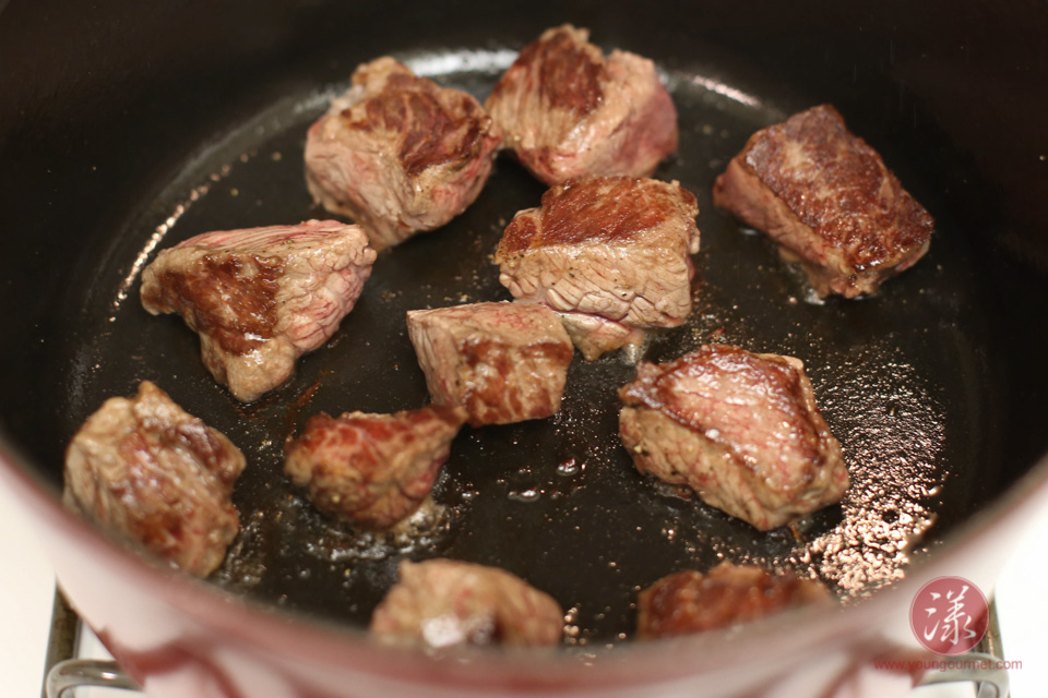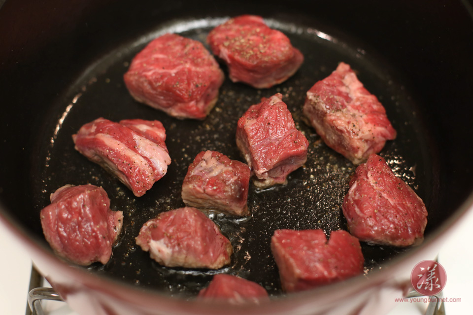 注意要让每块牛肉都有足够的间隔,这样才可以确保煎黄牛肉块,产生梅纳兹(Maillard Reaction),获取丰富的香气和口感。如果一次加入过多牛肉块,大量产生的蒸汽产生会导致无法很好地煎香牛肉块。