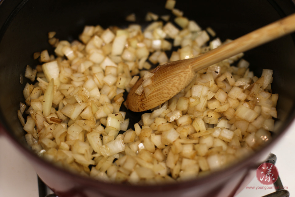 3) 在原先的锅中,加入一大匙油,加入洋葱和蒜末,中小火翻炒至飘香,洋葱变透明。