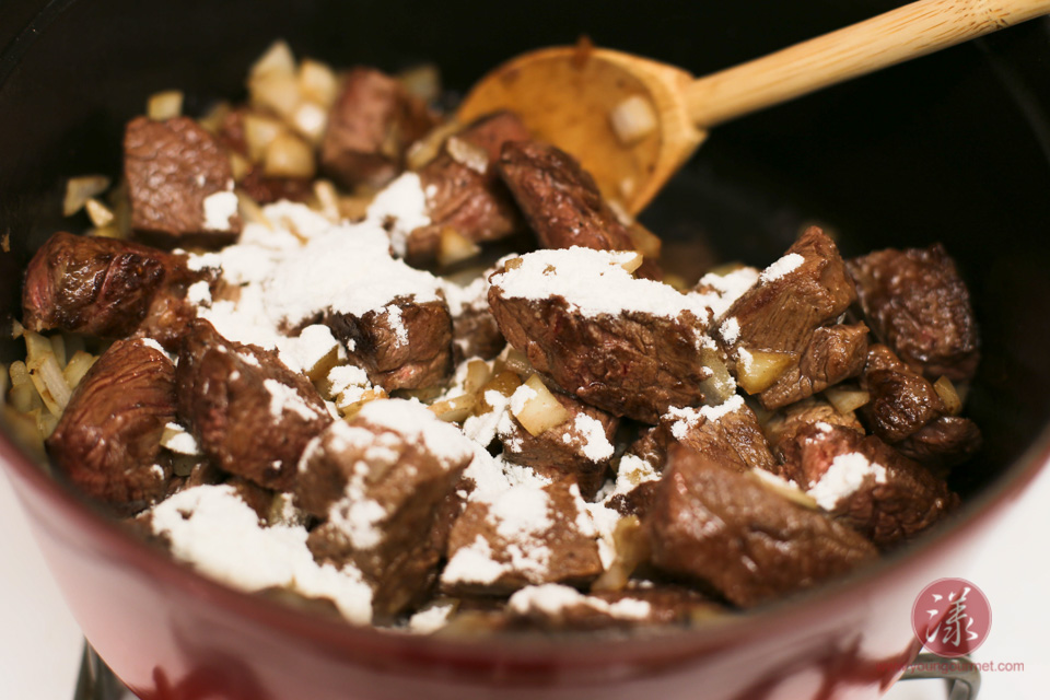 4) 将煎好的牛肉连带汤汁全部加入锅中,撒入一大匙面粉,略微翻炒至不见即可。这里加入面粉的目的主要是为了增加汤汁的厚度。