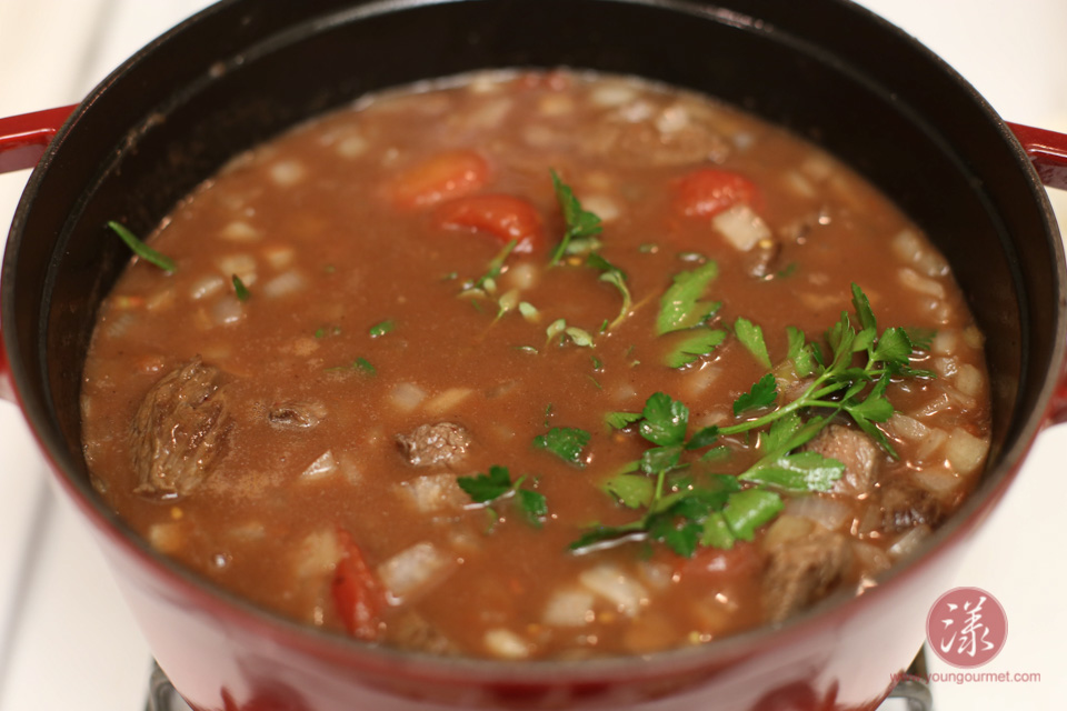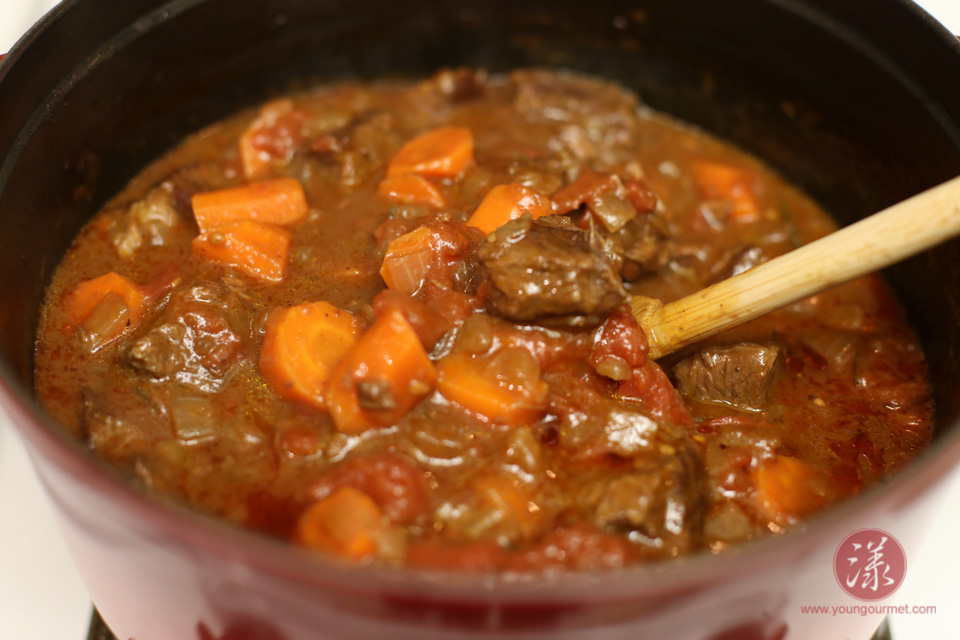 另外,添加干红葡萄酒、高汤和番茄(罐头)的原则是汤汁总体上可以刚好盖过牛肉。如果大家用了番茄膏,那就要相对多添加葡萄酒和高汤。基于选用的葡萄酒、高汤和番茄的口感都不同,最终用量还是要依据自己的喜好加以调整。