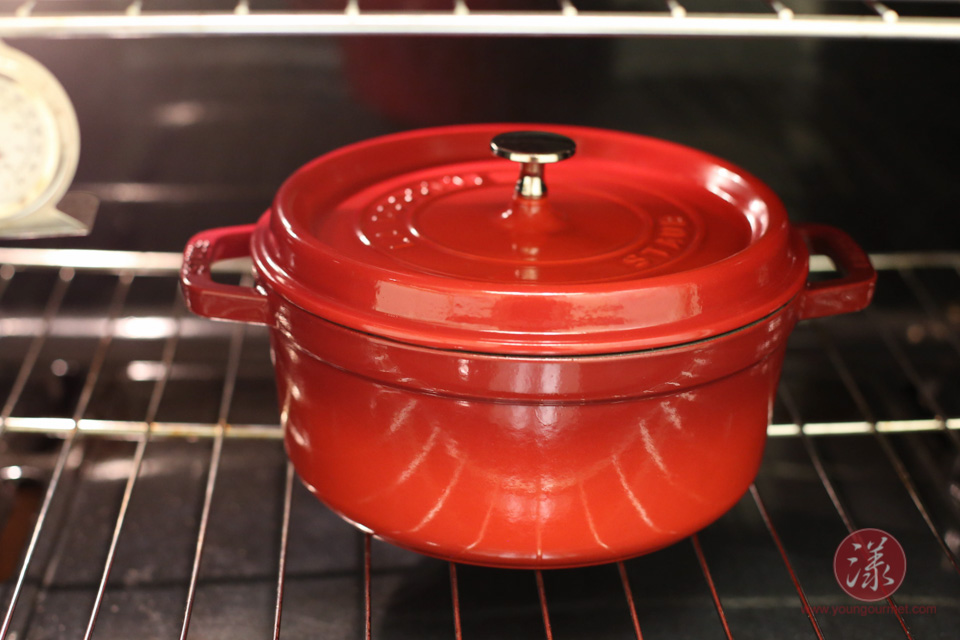 6) 盖上锅盖,放入预热好的烤箱 (350华氏度 / 175摄氏度),慢炖约2小时。