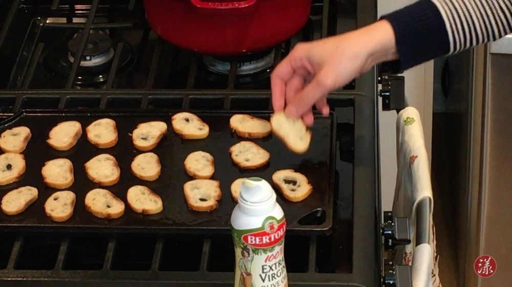 6) 法棍切薄片,涂橄榄油烤至香脆;可以放入烤箱烤 (350 F / 175 C),也可以像视频中一样直接在灶台上烤
