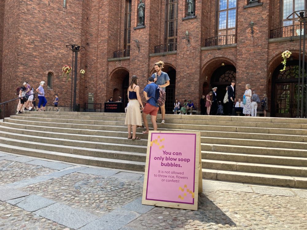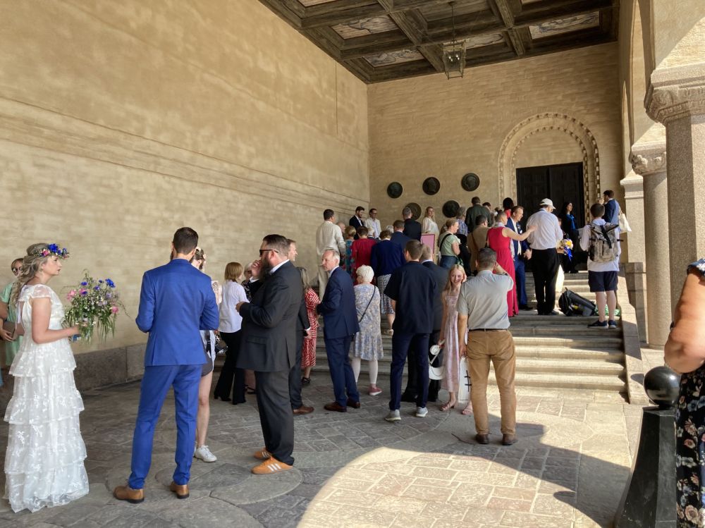 斯特哥尔摩的市政厅是座非常漂亮的建筑群,那金黄的钟塔是城市的标志。某日我们去到了那座红砖城堡。好多人啊,人们都穿着漂亮的衣服。原来,那天有200对新人登记结婚。我特别喜欢看婚礼,因为那是普通人最漂亮的时候。尤其是婚礼上女士们的衣裙,平时不常见的漂亮裙子都会在婚礼上出现。我跟BB说:“从现在开始我要好好物色漂亮的裙子、鞋子、帽子,为儿子,女儿的婚礼做准备。”
