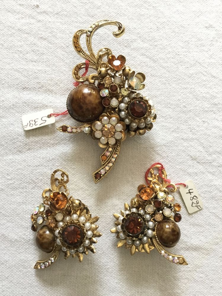 店铺开起来,不消两日,橱窗就琳琅满目了起来。那一件件漂亮的小东西都是我在漫长岁月里一次次的“一见钟情”。譬如这一套:那是1998年的八月我们在佛罗伦萨le ponte Veccio的珠宝店遇着的,BB对它印象深刻,因为那是他的“半个米” —— 半个million的里拉。那年一踏进意大利,我们的口袋就阔气了起来,随便买点什么就一掷万金。这款黄铜为底18K镀金镶嵌意大利商人赞不绝口的奥地利水晶共三件:胸针,耳环,戒指。戒指某年夏天在地中海游泳,被水里的sirène 悄悄顺走了。胸针和耳环,偶尔想起来会拿出看看看,几乎从来不曾戴过。