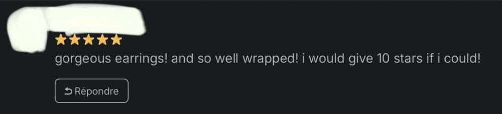 刚才还有顾客留言,他的原话:“gorgeous earrings ! and so well wrapped! i would give 10 stars if i could!” 看着这样的反馈能不开心吗?等会儿我会把这副gorgeous earrings的照片放在文章后面。