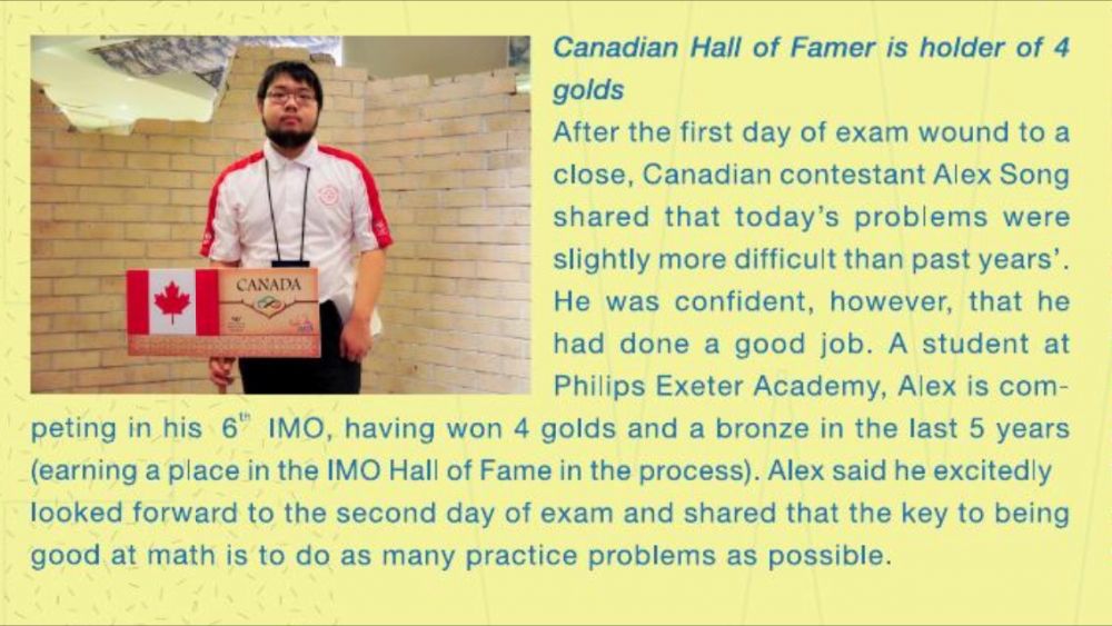 2、在美国著名私校Philips Exeter 就读、今年就要入读Pricenton、代表加拿大的华裔Zhou Qun (Alex) Song获得全场唯一满分,拿下个人历史上第五块金牌。他从七年级开始代表加拿大就拿了国际奥赛铜牌,八年级开始拿金牌,此次为五连冠,一举荣登名人堂Hall of Fame榜首!Alex这样的成绩简直令人发指!对不起,用词不当,不知怎么形容了!