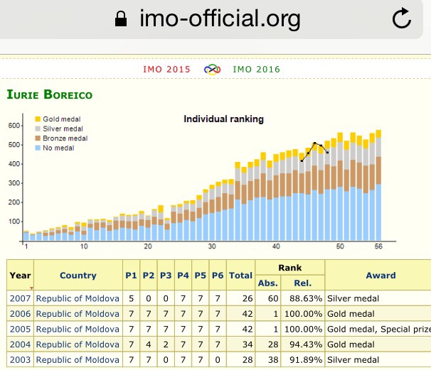 有沒有看出来这track record有什么问题?就象大学招生官看一个学生的高中成绩单一样,他是要看trend(趋势)的。如果一个学生四年高中修AP的课数是0,3,5,2,你会有何印象?对了,他最后一年不够挑战自己或者表现有下滑倾向。你看宋卓群第一年作为雏凤拿了铜牌,接下来全是金灿灿的。那陶哲轩更是芝麻开花铜银金一路上升(若不是上了大学,他后面应该还是金得发黄)。其他多金王也是开低走高的节奏。那Iurie怎么了?