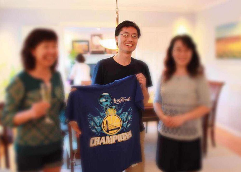 有位妈妈真有心有主意,搞来一件今年最火的NBA篮球冠军金州勇士队的T恤,作为硅谷父母们的礼物送给了Poh-shen,上面用粗笔写了贺词。