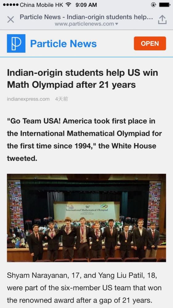 有趣的是,印度报纸大肆报道那一个半印度裔学生Shyam Narayanan和Yang Liu Patil。这个Yang Liu Patil也被中国大肆报道了一番。他被中印美三国广泛报道,算是几亿宠爱在一身啊!请看印度报纸的报道: