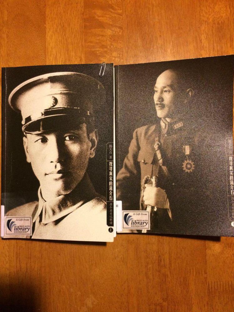 前些日子,遇到一个来斯坦福的访问学者,研究民国史的。我一听,就问他知道郭岱君吗?他说正是他现在的指导教授。这郭岱君很是了得,正是她说服蒋家后人蒋方智怡(蒋经国幼子蒋孝勇之妻)将蒋日记保存在斯坦福50年。然后我问他认识不认识中国头号民国史专家杨天石,他吃了一惊。其实我几年前看了杨天石写的关于蒋日记的书《认识真实的蒋介石》,最近几天又在看他的另一部书(上下两册)《找寻真实的蒋介石》。所附的照片即是这套书的封面。你会发现这封面设计很坑爹,书名在书页边缘几乎看不到的地方。Anyway, 我因多次带朋友去看蒋日记,每次都选取片段一读,所以看杨的书时也与我所看日记片段作一比较。