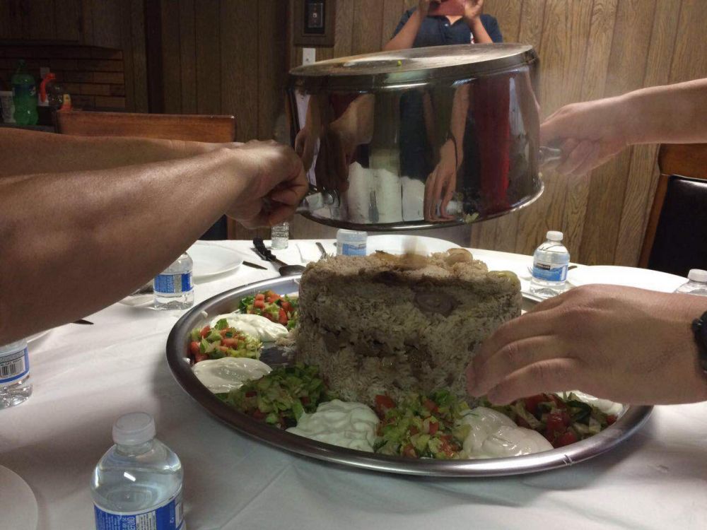 本虾的胃一向爱国,但这次的土耳其饭却还对胃口。以下照片向你显示一口大锅倒扣在一个大铁板上,旁边围绕着蔬菜色拉和酸奶。把大锅移去,里面是米饭、牛肉、土豆、洋葱的混和物。据说这饭要花三小时蒸煮,他们平时也不做。是否相当于我们包饺子啊?