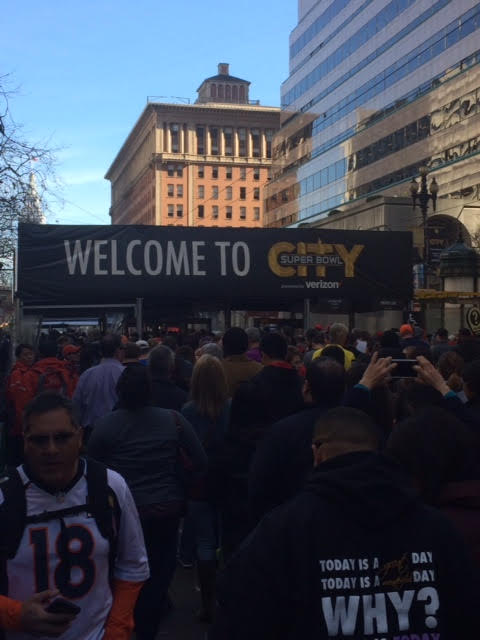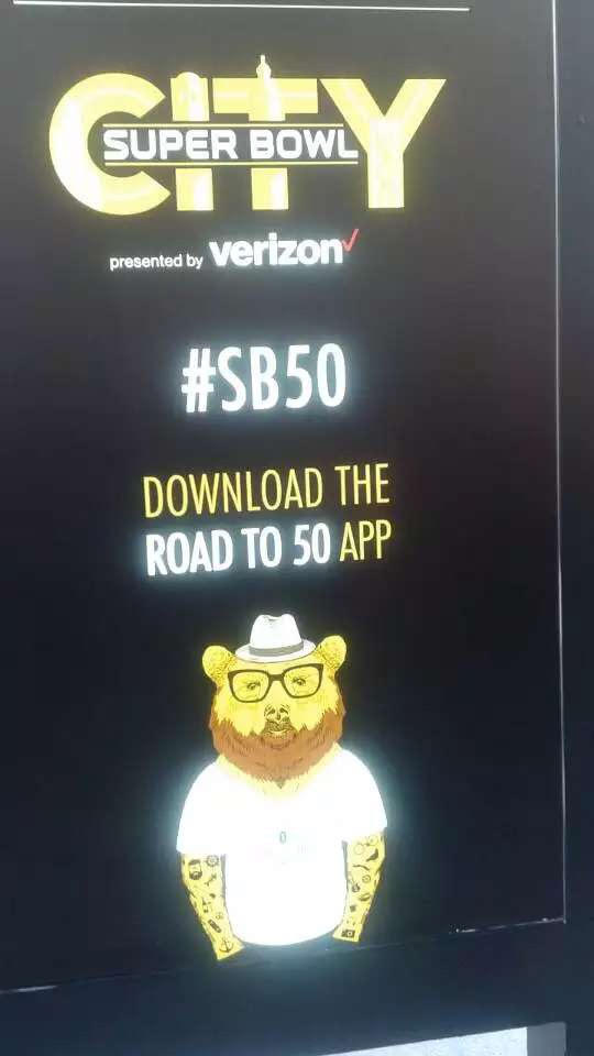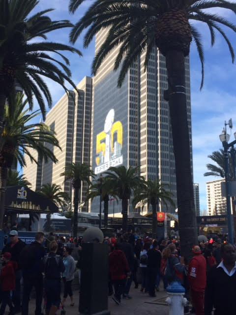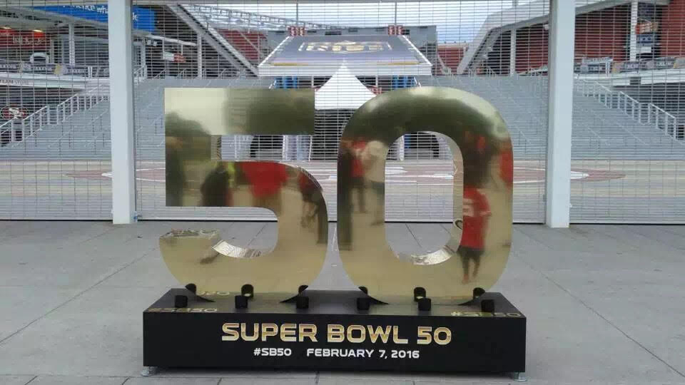 今年的票价最低要五千美元一张,黃牛票更炒到天价了(too amazing to be true)。最近几天美国各地的球迷蜂拥而来,这里所有的酒店爆满。交通也开始拥堵,本虾公司甚至在周五下午就允许员工提前在一二点钟下班,以避车潮。今年的超级杯是第五十届,所以到到可见SB50的字样。二百年后就会有SB250了,这可是个骂人的黄金搭档啊!