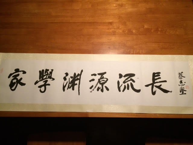 前年本虾帮国内画家蔡志坚先生办画展,蔡先生为本虾留了一幅字,就用了这句话。画廊柴老板主动提出免费帮我裱好。这柴老板不但热心,而且一表人才。第一次见面就觉得面熟,仔细想想才明白长得象马英九。他最近又有画展,在San Leandro中国画廊, 欢迎去参观。